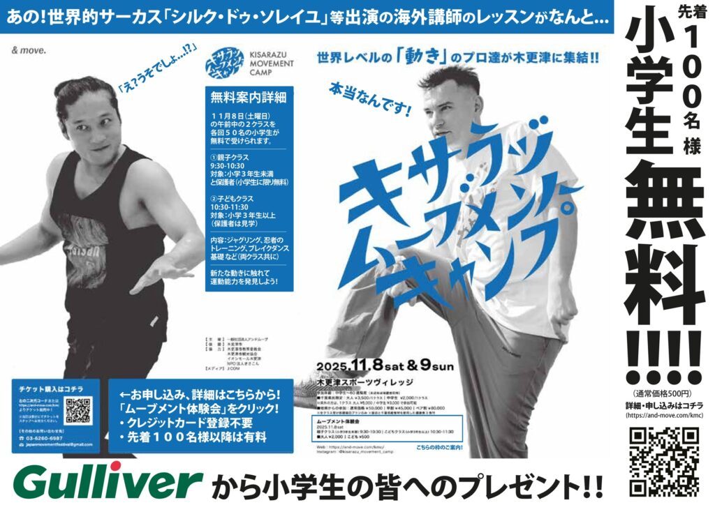 2025年は中学生以上向けの『キサラヅ・ムーブメント・キャンプ』と小学生と保護者向けの『ムーブメント体験会』を行います!更に!他県からの参加者様も1クラスからの参加も可能となりました!